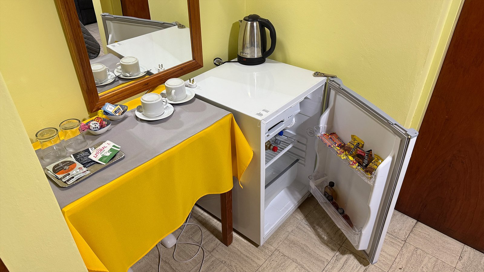 Frigobar con Bebidas y Chocolates – Desayuno Seco – Tetera Eléctrica.